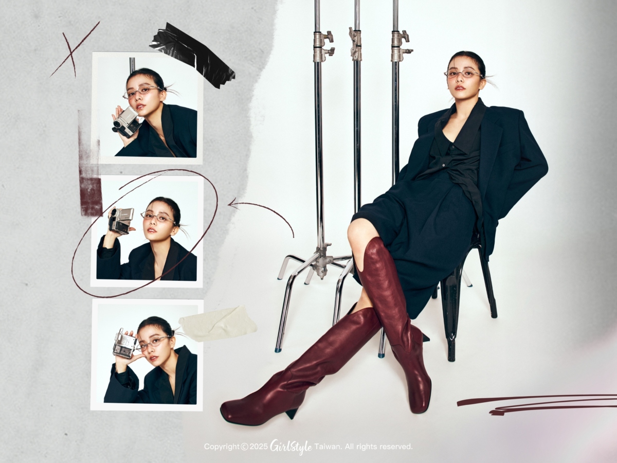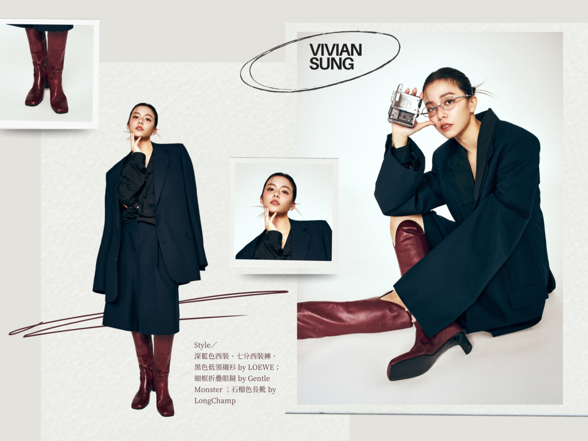 宋芸樺提及自己私下比較偏好硬挺的材質,因此在穿搭上特別鍾愛有個性一點的設計,「我很喜歡褲裝,也蠻多短裙,但都是硬挺的材質。」像這套來自 LOEWE 的深藍色西裝、七分西裝褲、黑色低領襯衫以及 Gentle Monster 細框折疊眼鏡,搭配一雙搶眼的 LongChamp 石榴色長靴,正好詮釋了她逐漸強大的內心,強調簡約而不簡單,運用乾淨的線條突顯出個性與內斂的美感,既強勢又不失優雅。