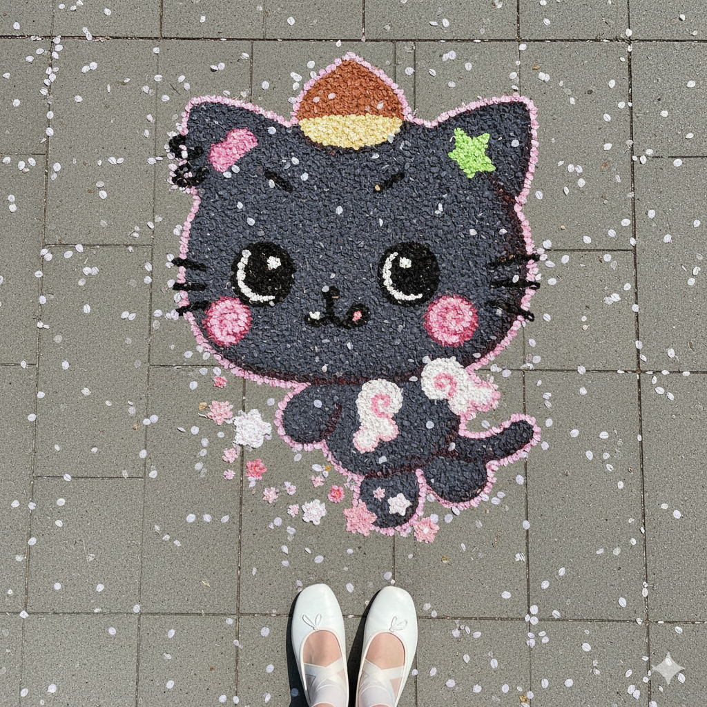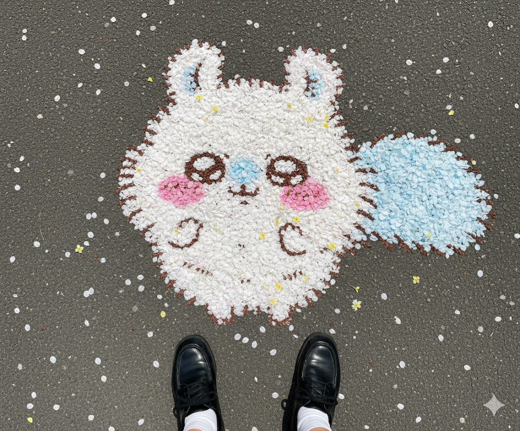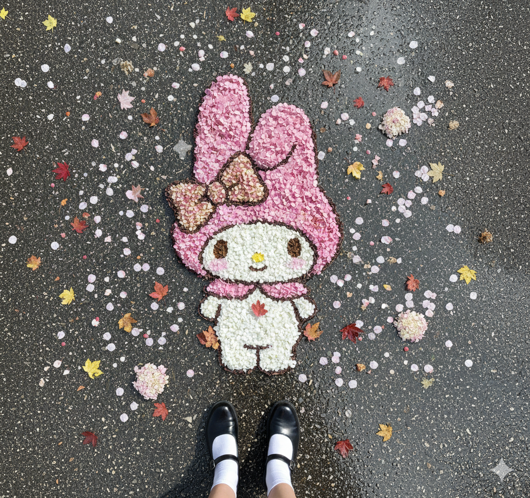 根據參考圖,幫我生成圖片,第一人稱視角(從上往下俯拍),道路上有用花瓣(淡粉色繡毬花、白色繡毬花)和一些落葉拼成的圖中卡通形象,拼出來的圖像邊緣顏色過渡自然,街道(不要水泥地,在有點小碎石的柏油路上)周圍聚集著許多散落著花瓣和落葉,場景道路充滿日式雨後的濕度及氣氛。要求生動立體複雜。腳(穿著jk的小皮鞋)不要踩到這張圖(距離圖片不要太遠)而且腳不變。這張圖中的形象整個身體在圖片里 並且沒有遮擋 可以適當減小圖中形象的大小。