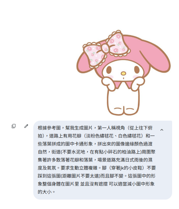 上傳一張想要製作的角色圖案,然後輸入以下指令,可以根據需求調整生成細節。如花瓣顏色、花種;街道種類(水泥地、木頭陽台、柏油路);天氣(晴朗、下雨天);鞋子款式(芭蕾鞋、瑪莉珍鞋、帆布鞋)等等。