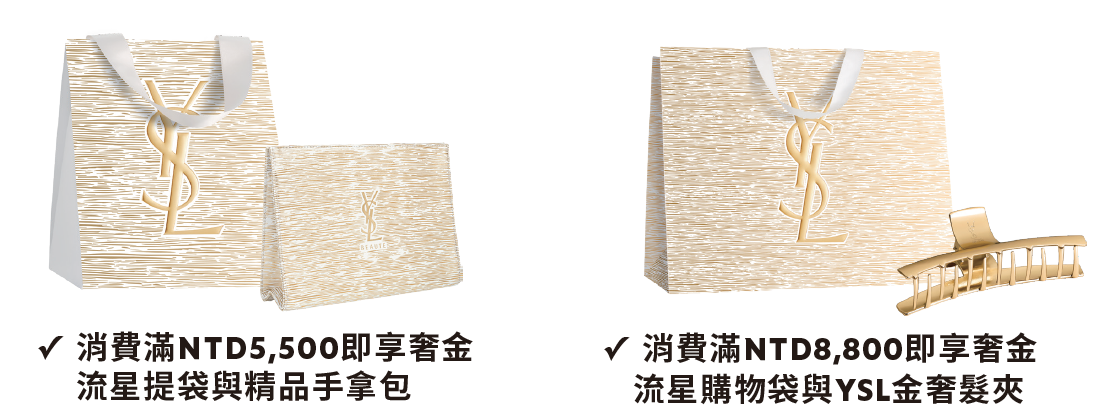 YSL BEAUTY將最經典的男、女香氛與彩妝,通通放入奢金流星限定包裝中,披上奢金流星限定外衣,9種閃耀高調光芒的華麗驚喜組合,不論是獻給摯愛、閨蜜或是犒賞自己,送禮、收禮都能表達與收到最璀璨的心意,滿額再享奢華禮贈,還有首度出現的金奢髮夾與手拿包,為節日時刻增添無可取代的儀式感!