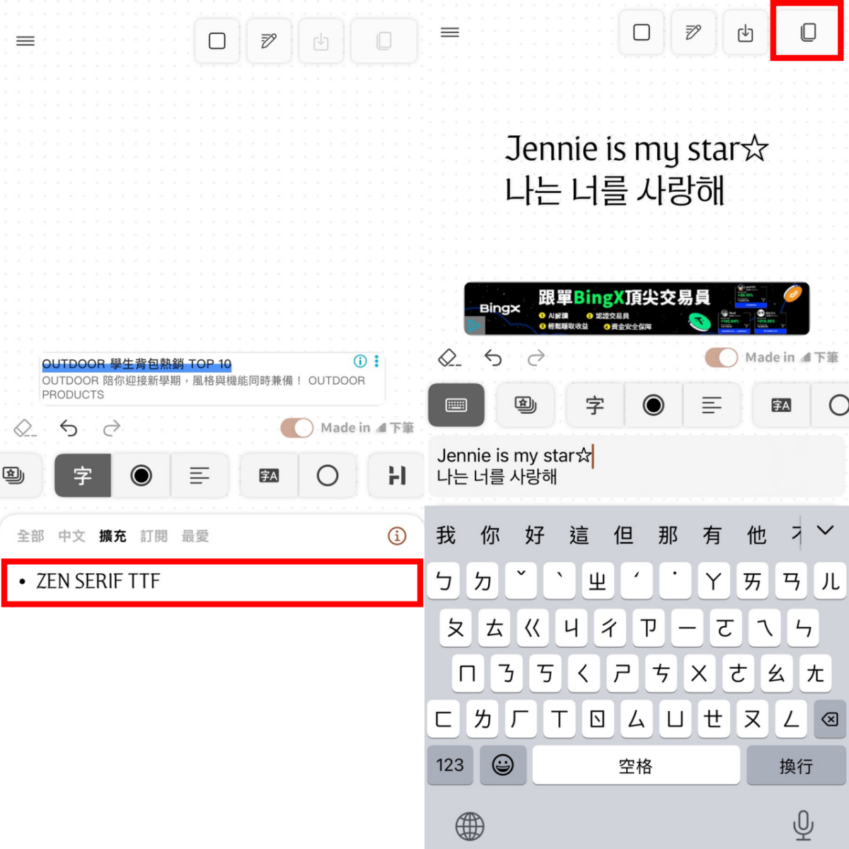 想要在手機上使用JENNIE字體的話,推薦大家可以下載「下筆App」,在App的設定裡匯入名稱叫「ZEN-SERIF-Regular.ttf」的檔案。