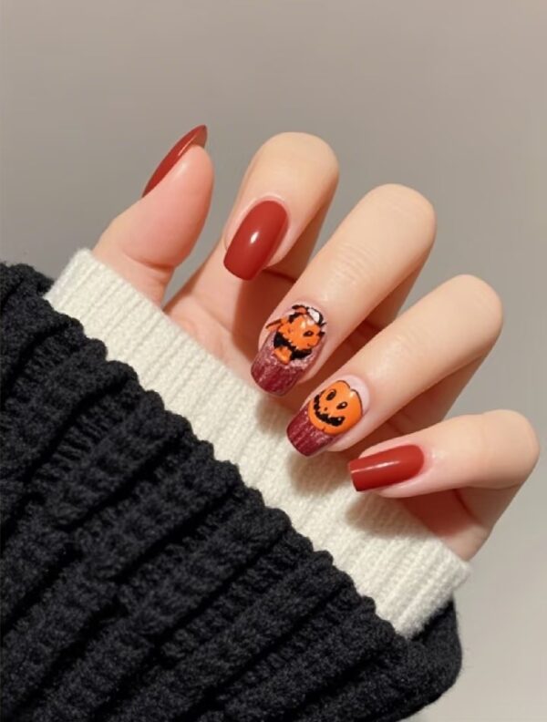 萬聖節怎能沒有南瓜呢?!但我們要告別那種俗氣的亮橘色,以「秋季豐收」與「溫暖觸感」的沉穩「髒橘色」代替,在西方國家的萬聖節家家戶戶都會到南瓜田裡,選一顆屬於今年的萬聖節南瓜來慶祝,利用這個靈感以奶油白、燕麥色等低包和色調搭配橘色系非常適合!運用秋日配色打造溫暖感的萬聖節美甲~