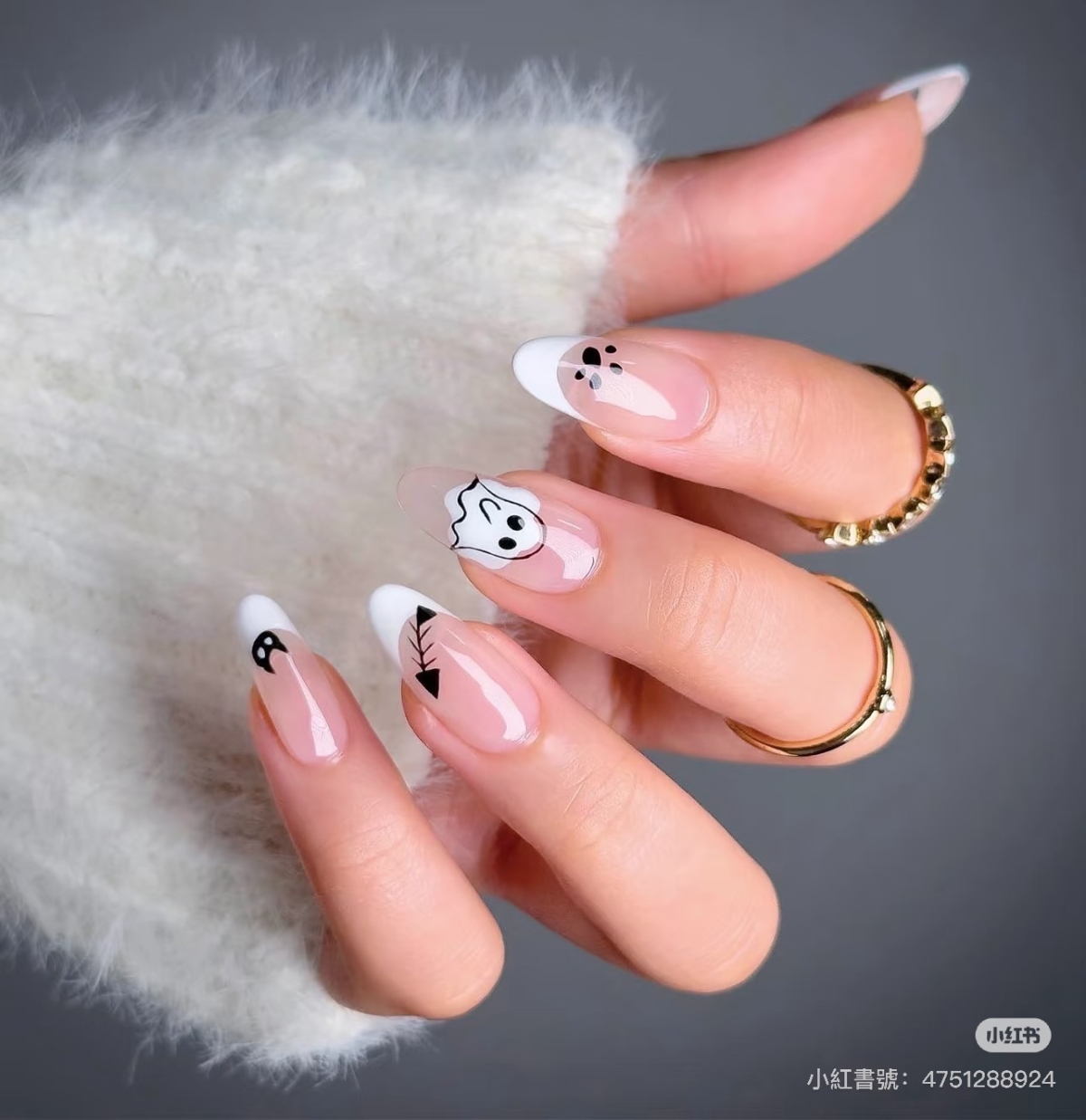 誰說萬聖節一定要極盡繁複、詭譎?以幽靈為主題的美甲完全就是「可愛」與「時髦」並存的代表!以法式美甲的基礎下去延伸,將指尖的白色弧線手繪成幽靈的圖案,不僅讓美甲整體看起來更可以融入日常,也不失節日氛圍。這樣簡單的美甲非常適合短指甲或中長指甲,低調到足以應付日常工作,卻又在細節中藏著節慶的玩心,適合那些內心古靈精怪,但外表依舊追求簡約質感的女孩們~