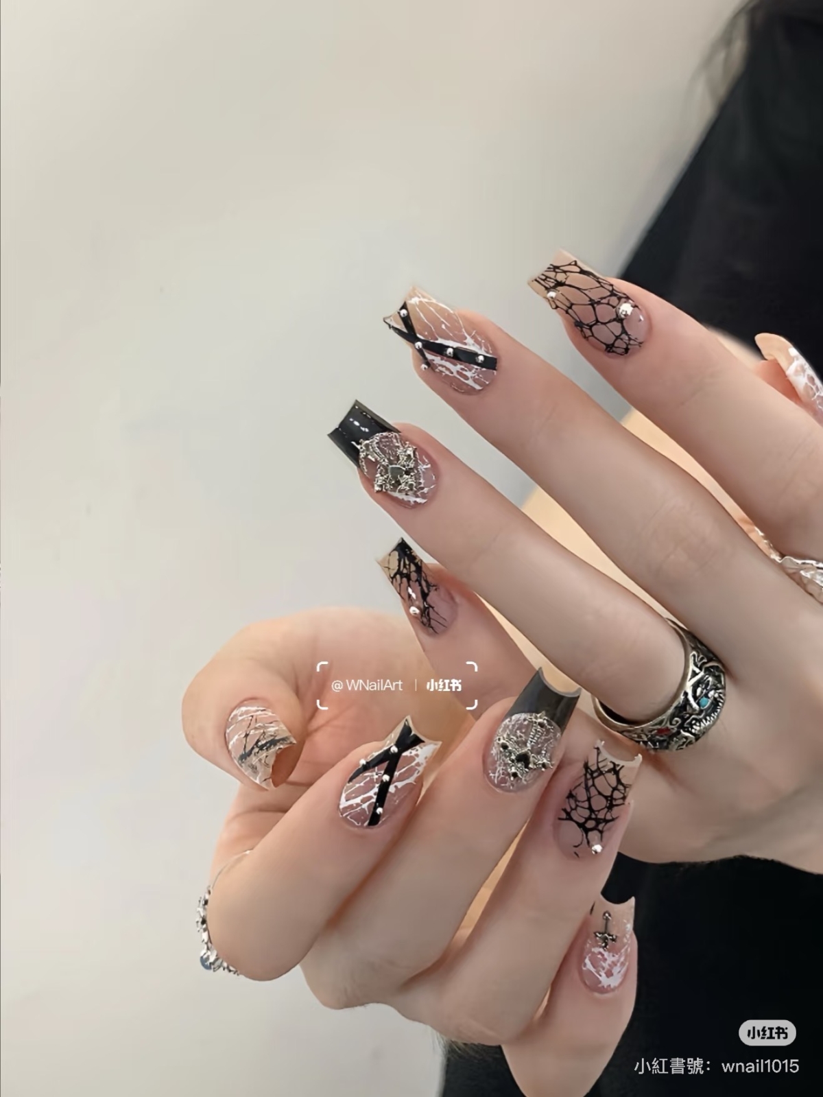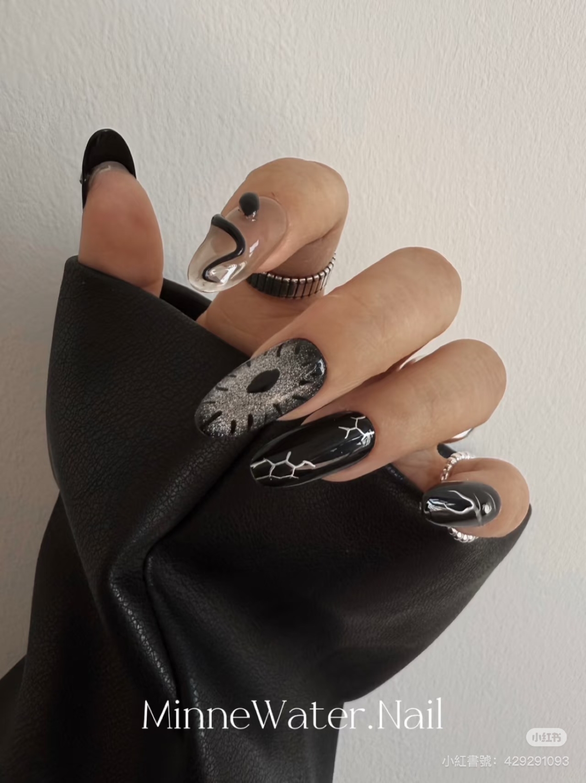 這款華麗的哥德式風格應該非常挑戰美甲師的功力和眼力,以黑色、銀色、白色組成,最常見的元素會使用骷髏、蜘蛛網等暗黑氛圍的圖示來呈現,有時甚至可以添加貓眼元素讓整體更生動,戲劇張力更大,超級適合即將出席萬聖節派對的你!