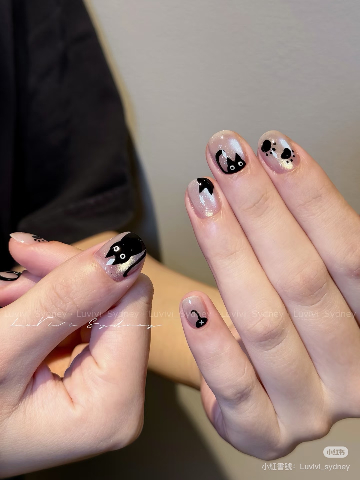如果你熱愛萬聖節的神秘氛圍,卻又不想過於張揚,那麼這款以「黑貓」為主題的美甲就很適合,在底色的選擇比起純黑色,不如選擇極深的「午夜藍」或「帶細閃的貓眼」款式,這能營造出更富層次的夜空感。再加入黑貓、月夜等元素,就能擁有一組低調而華麗的萬聖節美甲啦!