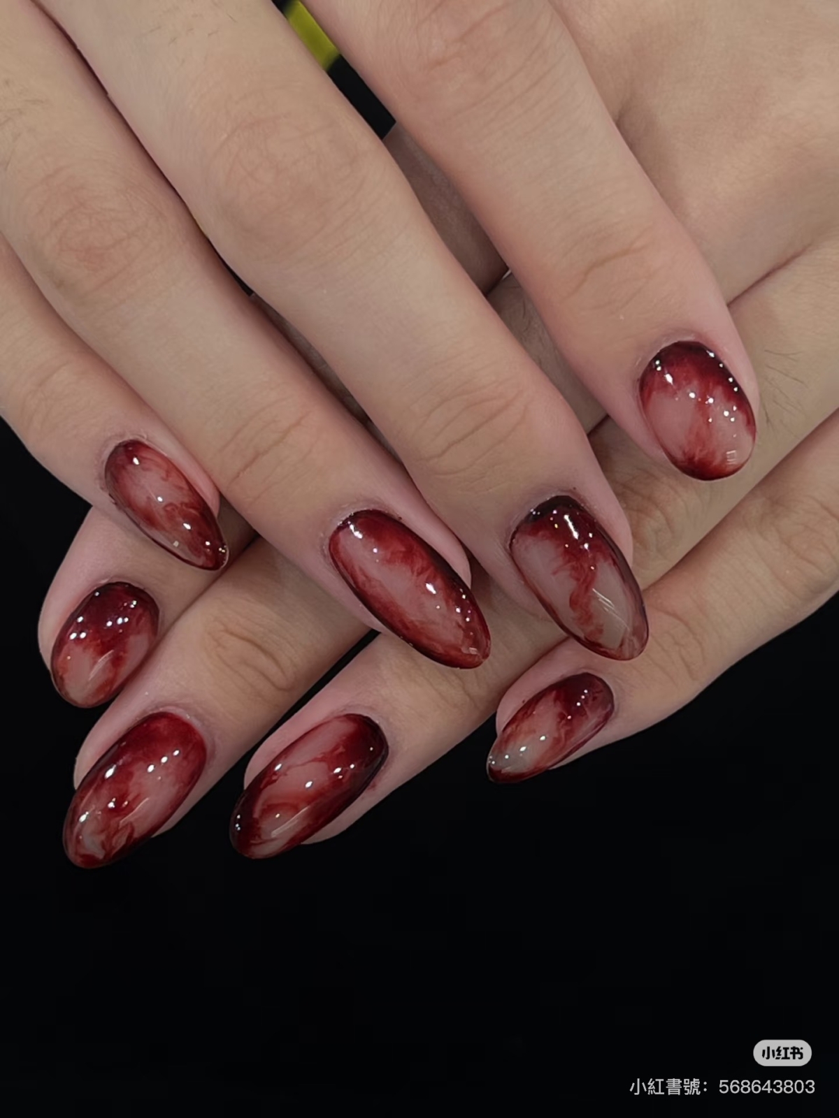 如果萬聖節對你而言,是性感、驚嚇的綜合體那這款「擬真血滴」絕對會是個好選擇!不是卡通式的血漿,而是彷彿剛從吸血鬼晚宴歸來的、帶有黏稠質感的致命誘惑。以「果凍紅」或「血珀色」凝膠作為主角,在指尖上呈現出不同大小錯落的血漬,不需要過多的裝飾,單憑簡單的血流效果就能足以傳達「萬聖節」氛圍。