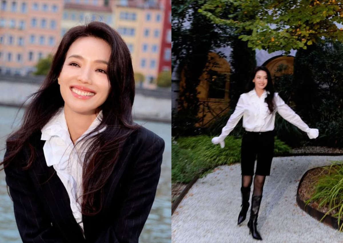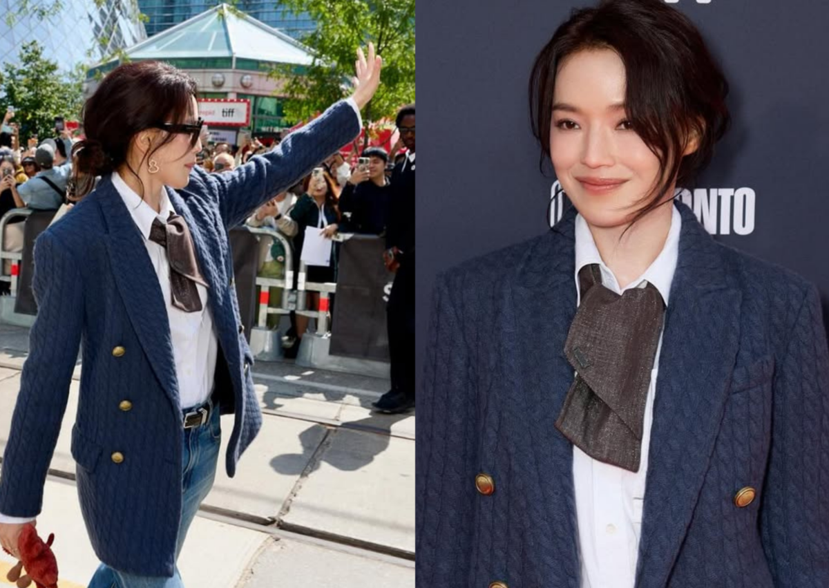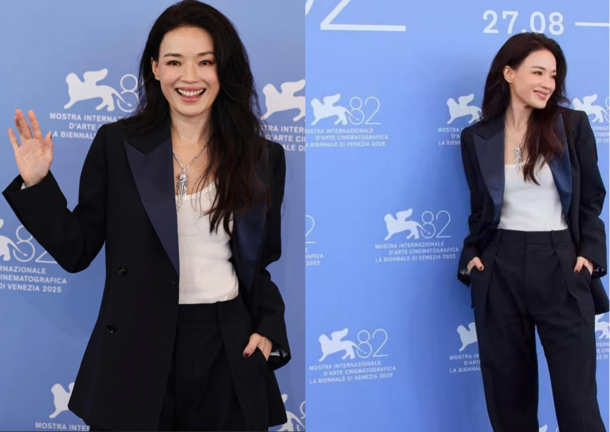 舒淇近期出席 2025 年多倫多影展時,身穿 Brunello Cucinelli 深藍雙排扣西裝外套、白襯衫和牛仔褲,穿出最經典永恆且不過時的穿搭,再疊搭一條棕色領巾,讓層次感更顯精緻優雅,腳踩 Jimmy Choo 黑色綁帶高跟鞋,搭配 Qeelin Wulu 珠寶系列點綴。