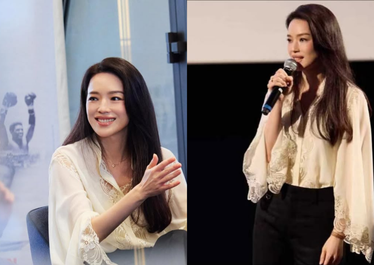舒淇這套來自 Chloé 秋季系列,身穿米色真絲雪紡花邊襯衫,搭配黑色羊毛呢絨西裝褲,看似極簡的剪裁線條中,用蕾絲、荷葉邊注入一絲浪漫氣息,很符合現在身為導演的舒淇氣質。