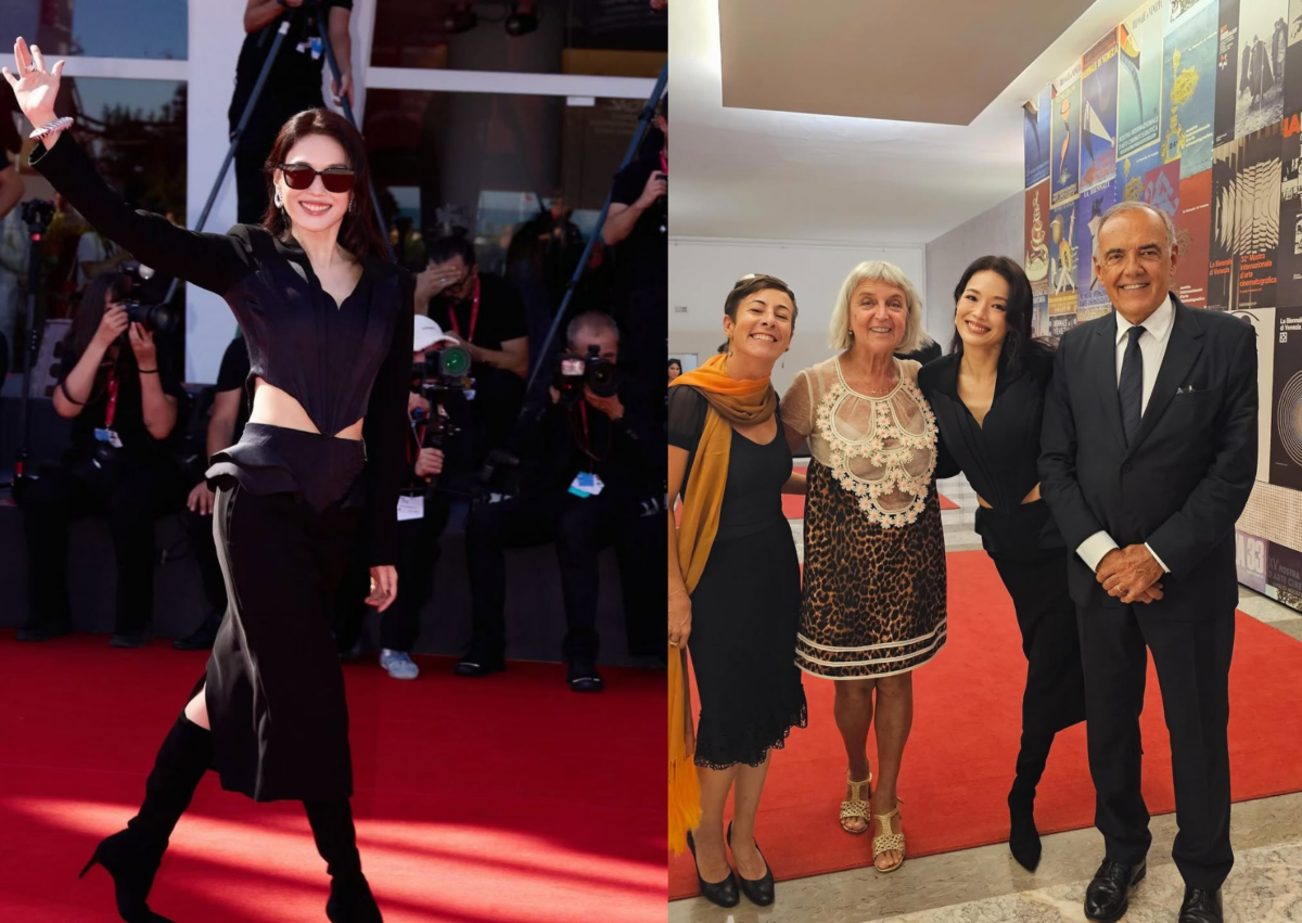 舒淇帶著首部執導長片《女孩》現身威尼斯影展,身穿 Bottega Veneta 新任創意總監 Louise Trotter 親自設計的寬版剪裁線條西裝套裝,在翻領上做獨特設計,加入深藍色的緞面拼接設計,為低調造型注入細節與層次,配戴卡地亞典藏系列手環、Panthère de Cartier 長項鍊與戒指,美洲豹的鮮明形象,更完美呼應穿戴者的霸氣魅力。