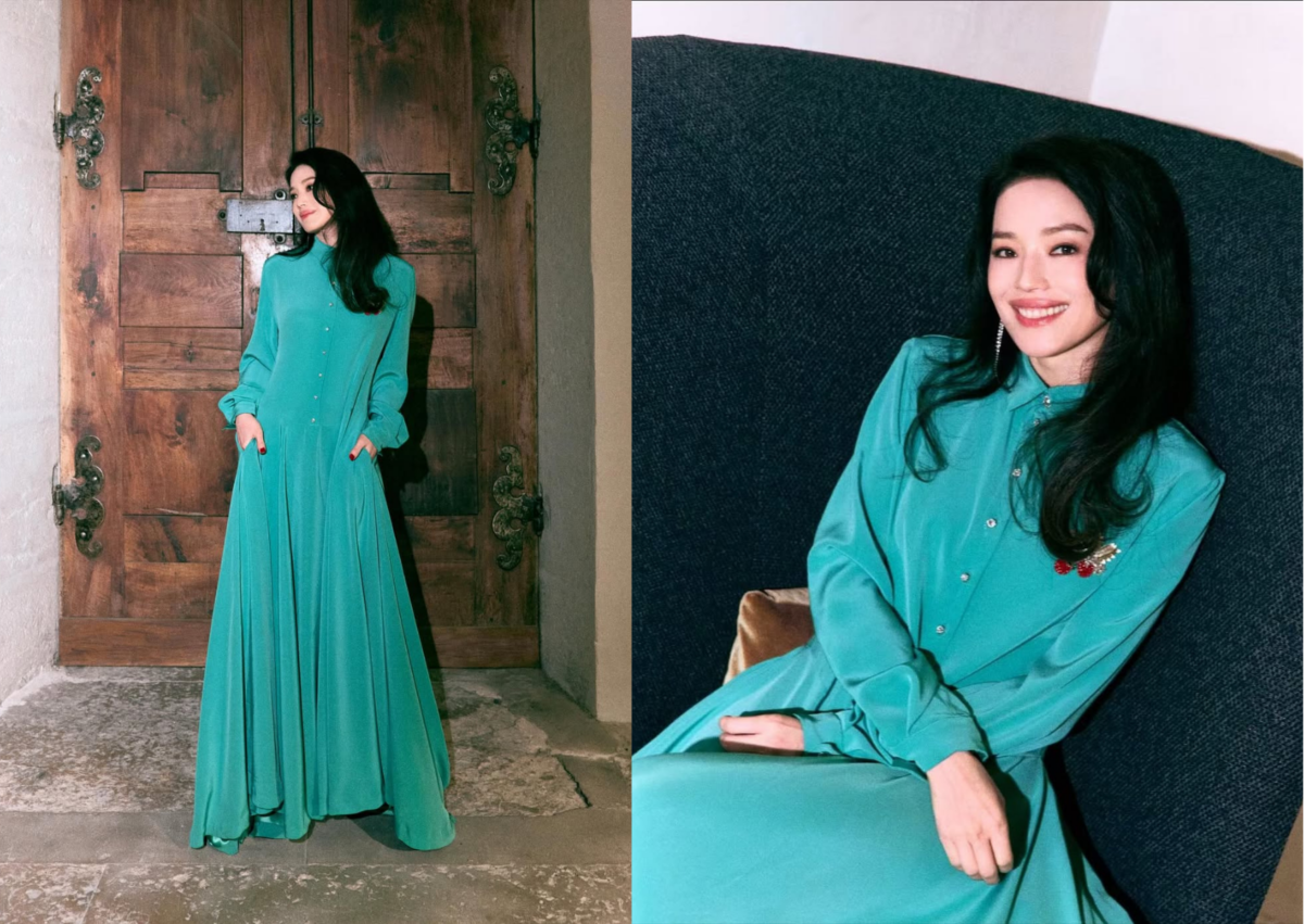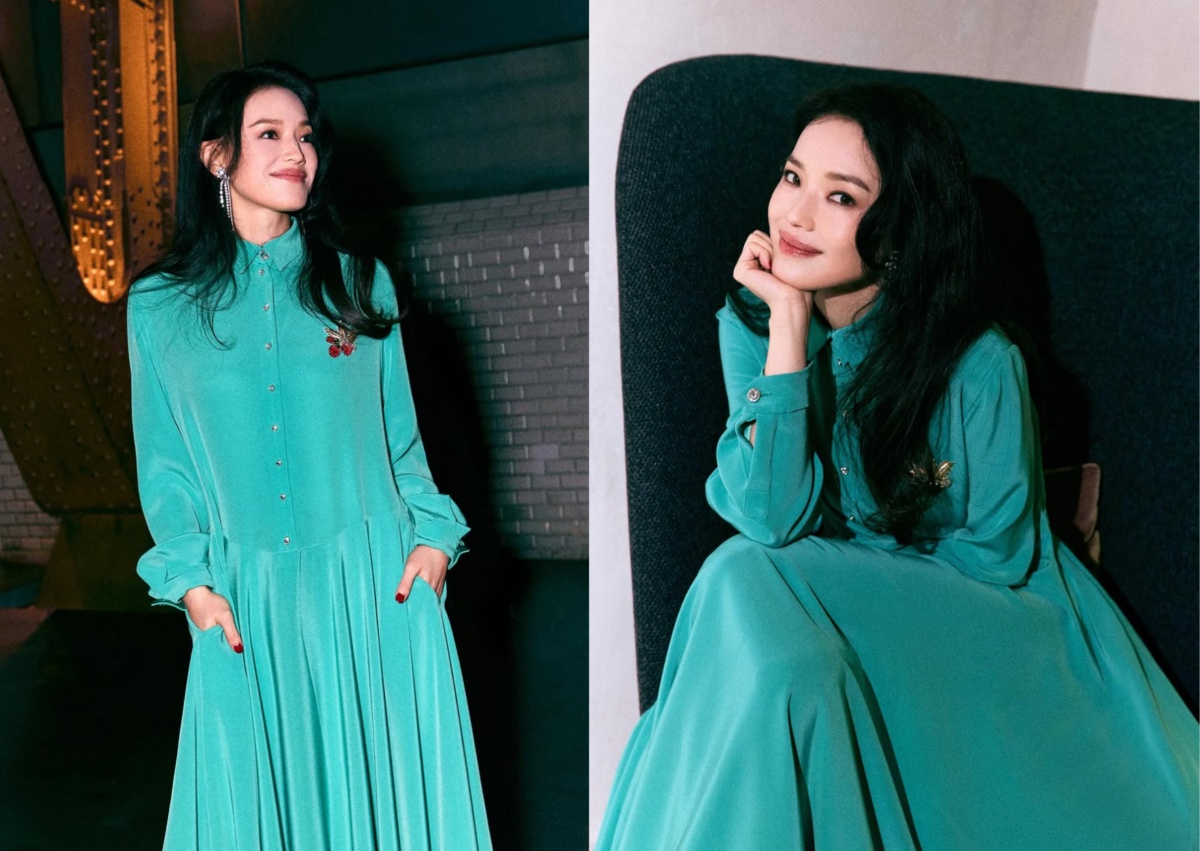舒淇以導演身份受邀法國盧米埃電影節,身穿一襲藍綠色高級訂製洋裝,採用絲絨面料製成,襯衫領結合傘狀長裙的剪裁設計,散發知性氣息,服裝顏色更是凸顯了紅唇和白皙肌膚,腳踩 Roger Vivier 綠色緞面高跟鞋,珠寶則是選擇 Cartier 獵豹珠寶。